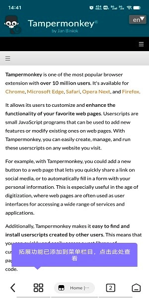 4、也可以在首页点击左下角的图标,随即能看到“我的扩展”板块,这里展示的便是已安装的插件。