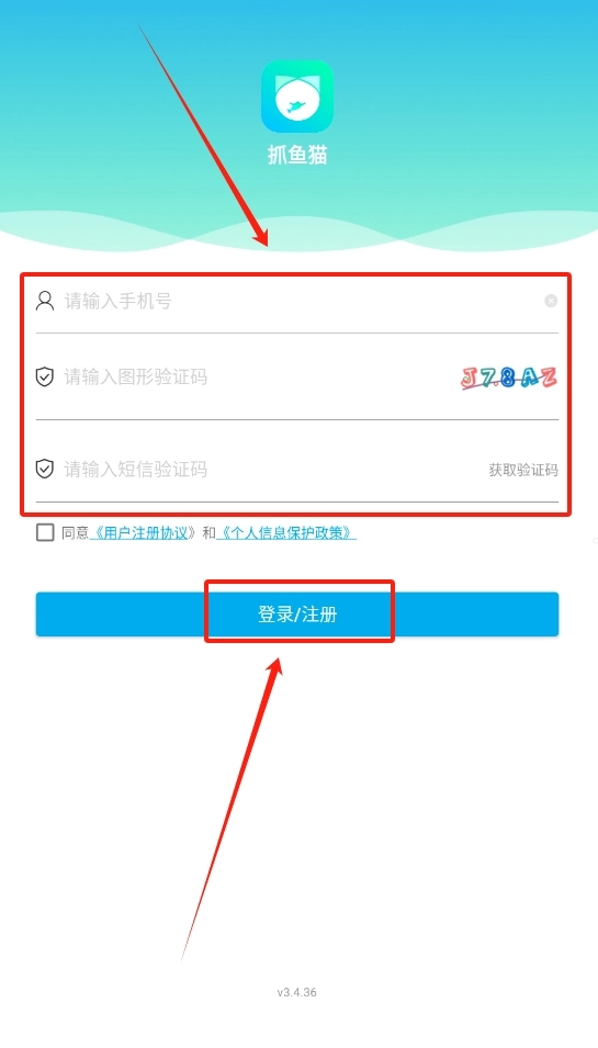 1、打开抓鱼猫先用手机号登录账号,这样能记录你的调研数据和奖励情况。