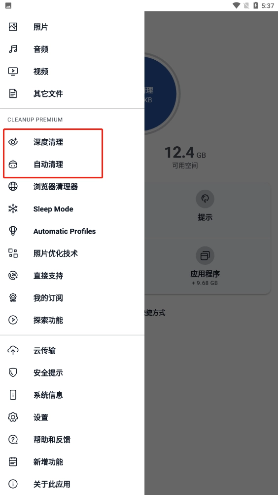 4、用户若想对手机进行深度清理或自动清理,可按以下步骤操作:首先点击首页左上角的三条横线图标,接着在弹出的选项中选择深度清理或自动清理即可。