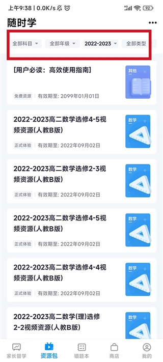 6、选择“资源包”选项,这里包含了全科目、全年级的视频资源,同时覆盖了多种不同版本。