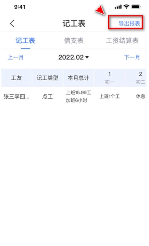 4.在记工表中找到导出报表并进入