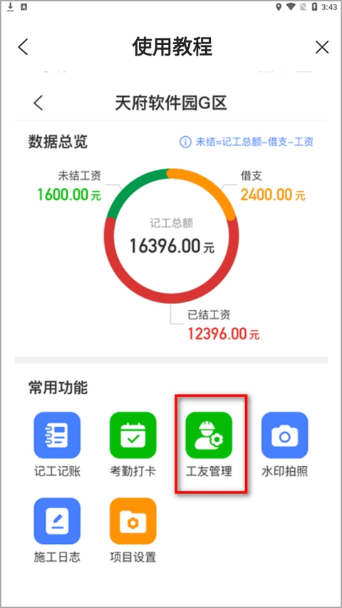 2.在项目工作台中找到记工记账模块并点击进入