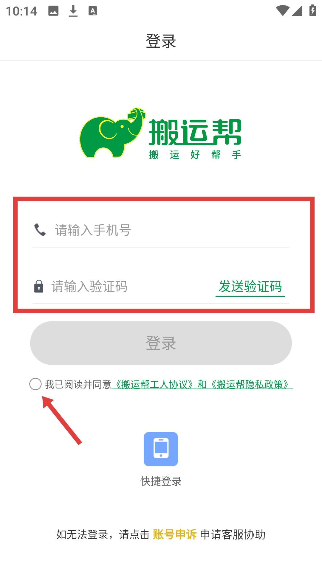 3、在登录页面输入手机号验证码,并勾选相关协议,完成登录前的准备操作。