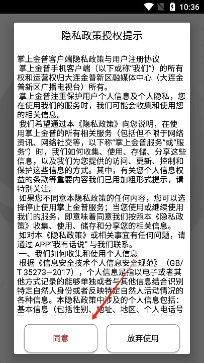 2、进入后同意掌上金普的用户协议。