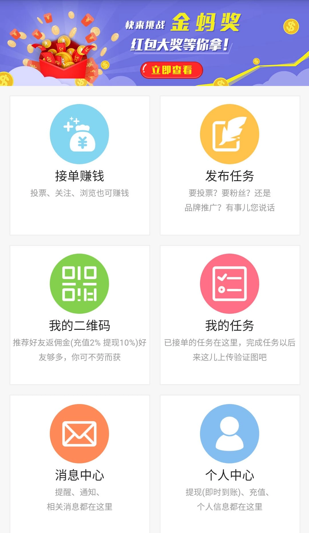 这是一个自助互帮的平台,商家可以在这里发布需求,成千上万的用户会合力帮忙,助力商家快速达成商业目标;而用户则能利用零碎时间赚取合理的佣金。平台会担保交易的公平性,提供正规的自然人投票、转发、注册体验、产品推广以及商务推广等服务。