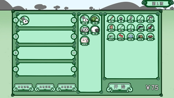 第五波:买个『猪+大炮+望远镜】(把猪放到第1队第7个的位置),然后买5只【兔子+石头】,再把它们分到三队,开始后将1队放房子中间,把3队放1队上面,然后2队还是跟原来一样(中途可以用黑豹略微勾引一下boss,别被打到了)