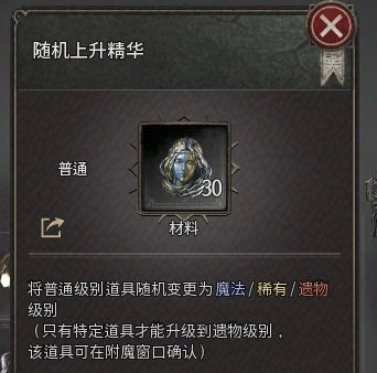 第二步、使用随机上升精华赌一手运气,如果变成遗物级别,则停止(遗物装无法修改属性。且属性一般来说都很好)如果变成稀有则看下属性是否满意,不满意则回归第一步、不过理论上大概率变成魔法级别装备。