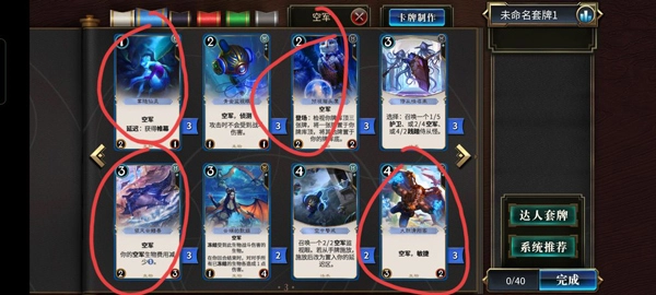 蓝色生物,低费好用的空军带满,领风是空天猎的核心,有这张牌才能快速铺场蓝色法术,尽量多带点过牌,但是也不要太多,会卡手,自己估摸着来红色,炎龙吐息带满,其他的解场牌看情况带跟法术配套的生物,也是要带满的还有一些牌也很不错,比如331冲锋、驳回、复颂、214嘲讽、**操控士,等等等等,只要你觉得ok的牌其实都可以试试。空天猎本身就是套强度尚可的过渡卡组,没有什么讲究,更没有标准答案这一说,有什么带什么。