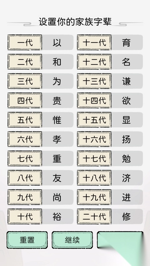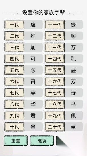 2、接着选择家族的字辈系统,从二十代字辈中任选一个作为家族传承;