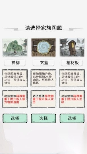3、玩家还需为自己的家族挑选一种图腾,各类图腾所具备的功法提升效果各不相同。