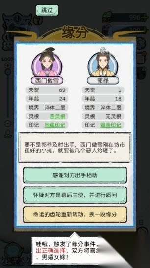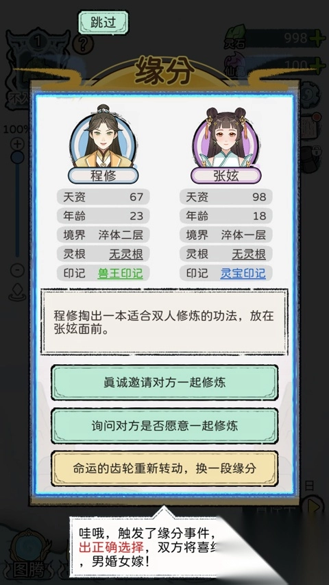 5、按照初期指引,你需要先找到一位合适的道侣,开启双修之旅;