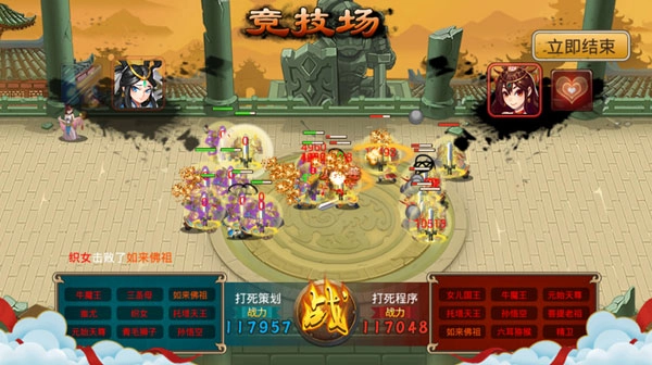 战况4:由于无敌buff在,对方女儿技能打空后,我方织女迅速一个技能压低对方全部仙将的血线