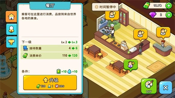 2、玩家开始经营后,可点击不同地区修复设施,解锁区域后顾客便会前来消费