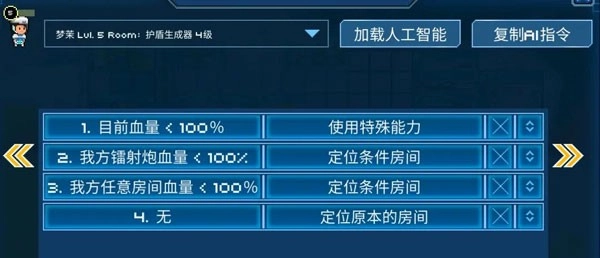1)AI的执行逻辑和高考填志愿的规则有点像——当多个条件都符合时,只会触发排序最靠前的那一条AI指令,排在后面的不管怎么设置都不会起作用。举个例子,如果给某个角色设定了“无条件 前往我方护盾室”的指令,那他就算血量低于50%、舰船血量也低于50%,到死都会待在护盾室里,绝不会去其他地方。