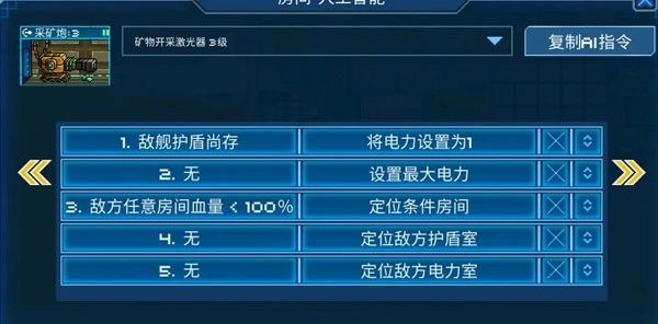 第一条是用来调节电力,在敌方有护盾的时候只给1格电,没护盾时满电运行。这只是一个范例,实战中矿炮一般是全程满电。但是各位玩家可以将这条ai用在各种房间上,来通过对方护盾的状态进行一个电力分配。