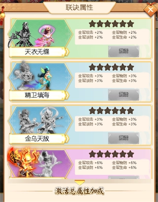 当主公拥有其中两个英灵的时候,可以激活连诀属性,从而增加全军四维的属性百分比,这个百分比增加的属性也是非常可观的。